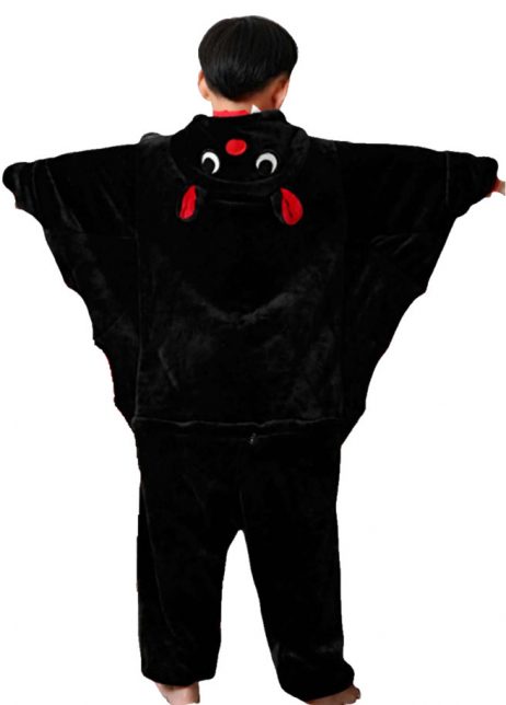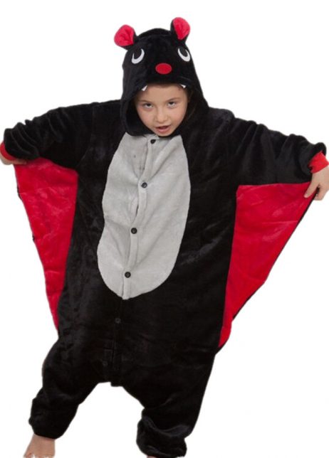 Deze vleermuis onesie is gemaakt van een fijne zwarte fleecestof met een grijze buik en rode vleugels. Dit model heeft een capuchon met daarop de tanden ogen en oortjes van de vleermuis.